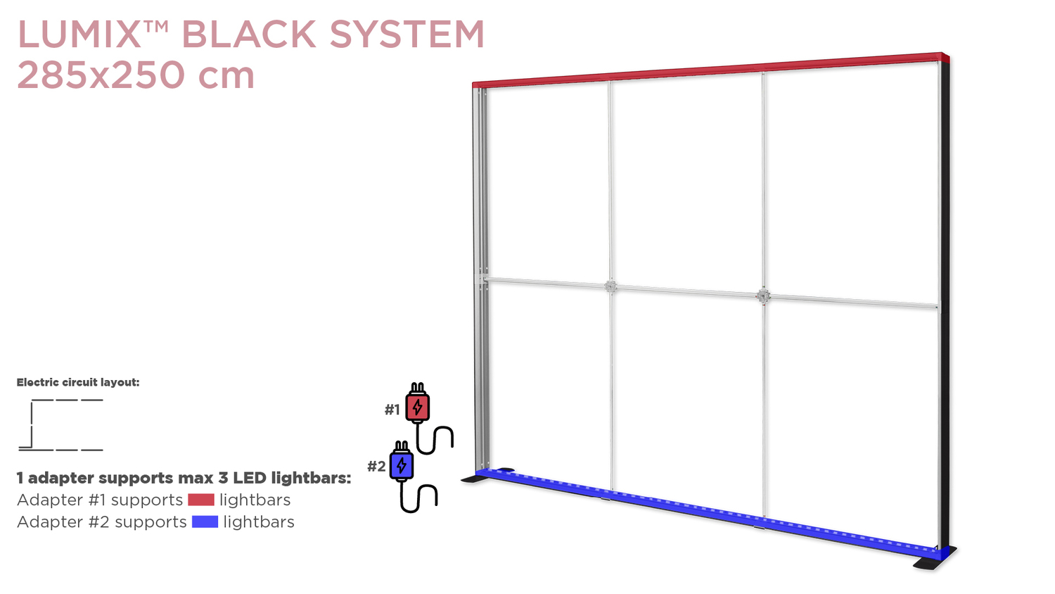 Rinkinyje: LUMIX™ BLACK sistema 285×250, maitinimo šaltinis (2 vnt.), krepšį su ratukais.